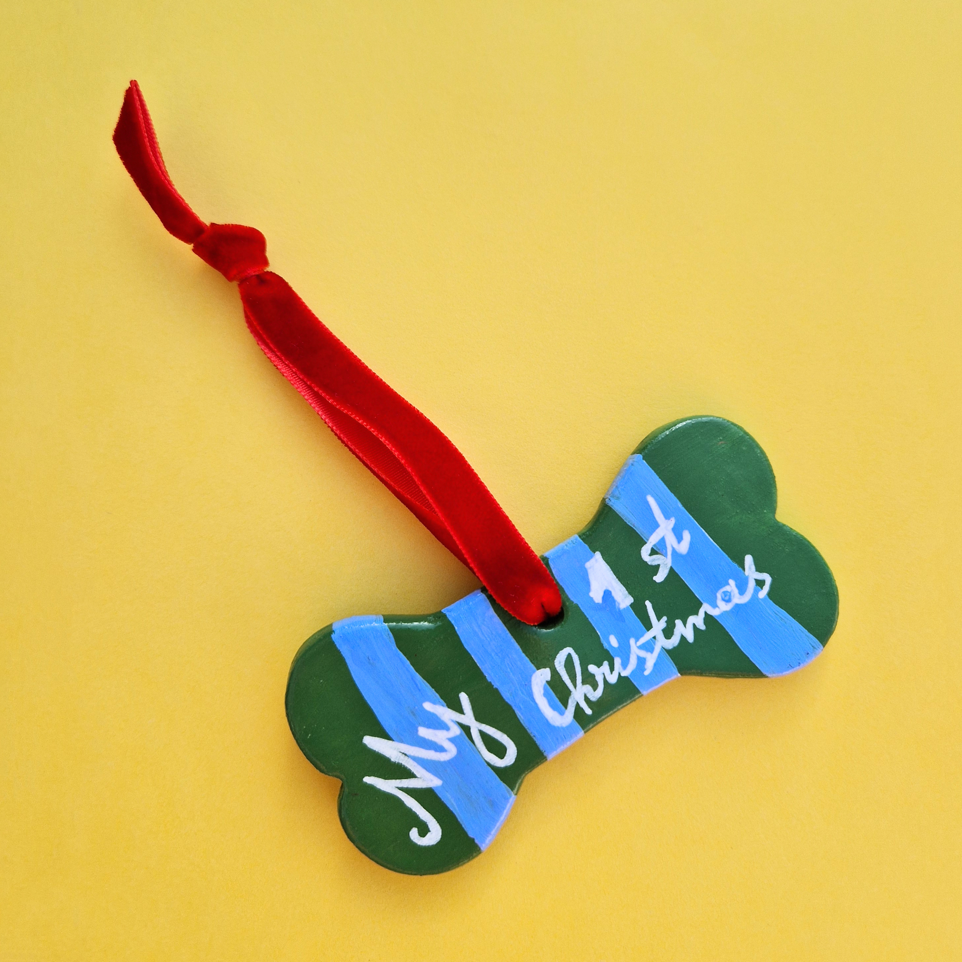 Το Χειροποίητο Χειροποίητο Χριστουγεννιάτικο Κεραμικό Στολίδι Γαλάζιο-Πράσινο Ριγέ Κόκκαλο My First Christmas είναι ζωγραφισμένο στο χέρι, ιδανικό για τα πρώτα Χριστούγεννα ενός κατοικιδίου. Φέρνει ζεστασιά και συναισθηματική αξία στο δέντρο και τη διακόσμηση του σπιτιού, δημιουργώντας μοναδικές γιορτινές αναμνήσεις που θα μείνουν αξέχαστες.