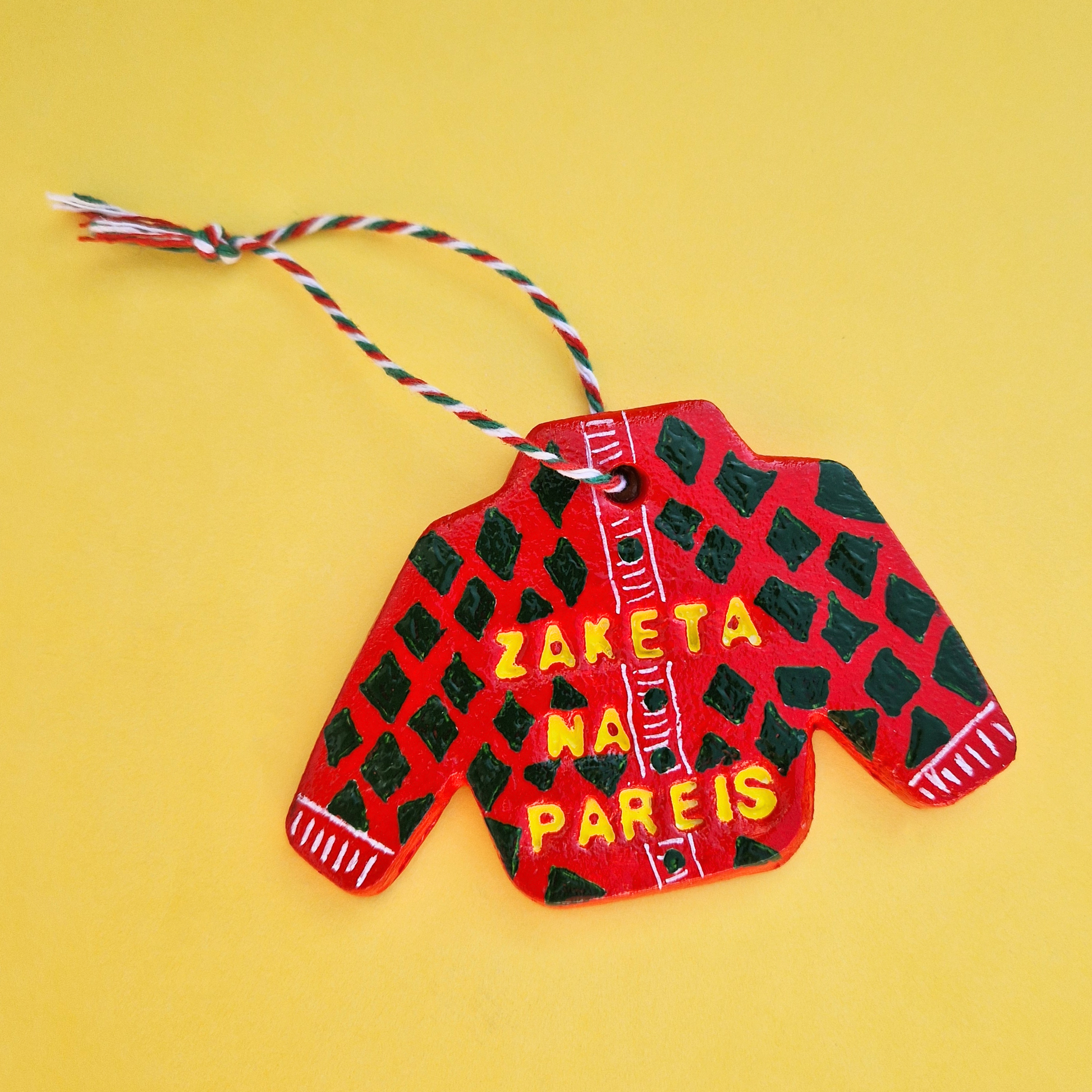 Το Χειροποίητο Χριστουγεννιάτικο Κεραμικό Στολίδι Κόκκινη Ζακέτα να Πάρεις (Zaketa Na Pareis) φέρνει γιορτινή χαρά και χιούμορ στο δέντρο και το σπίτι σας. Με λεπτομέρειες ζωγραφισμένες στο χέρι, αποτελεί μοναδικό στολίδι, γεμάτο συναισθήματα, ιδανικό για δώρα με αγάπη και γέλιο, όπως λένε οι μαμάδες: «Μην κρυώσεις, πάρε ζακέτα!»