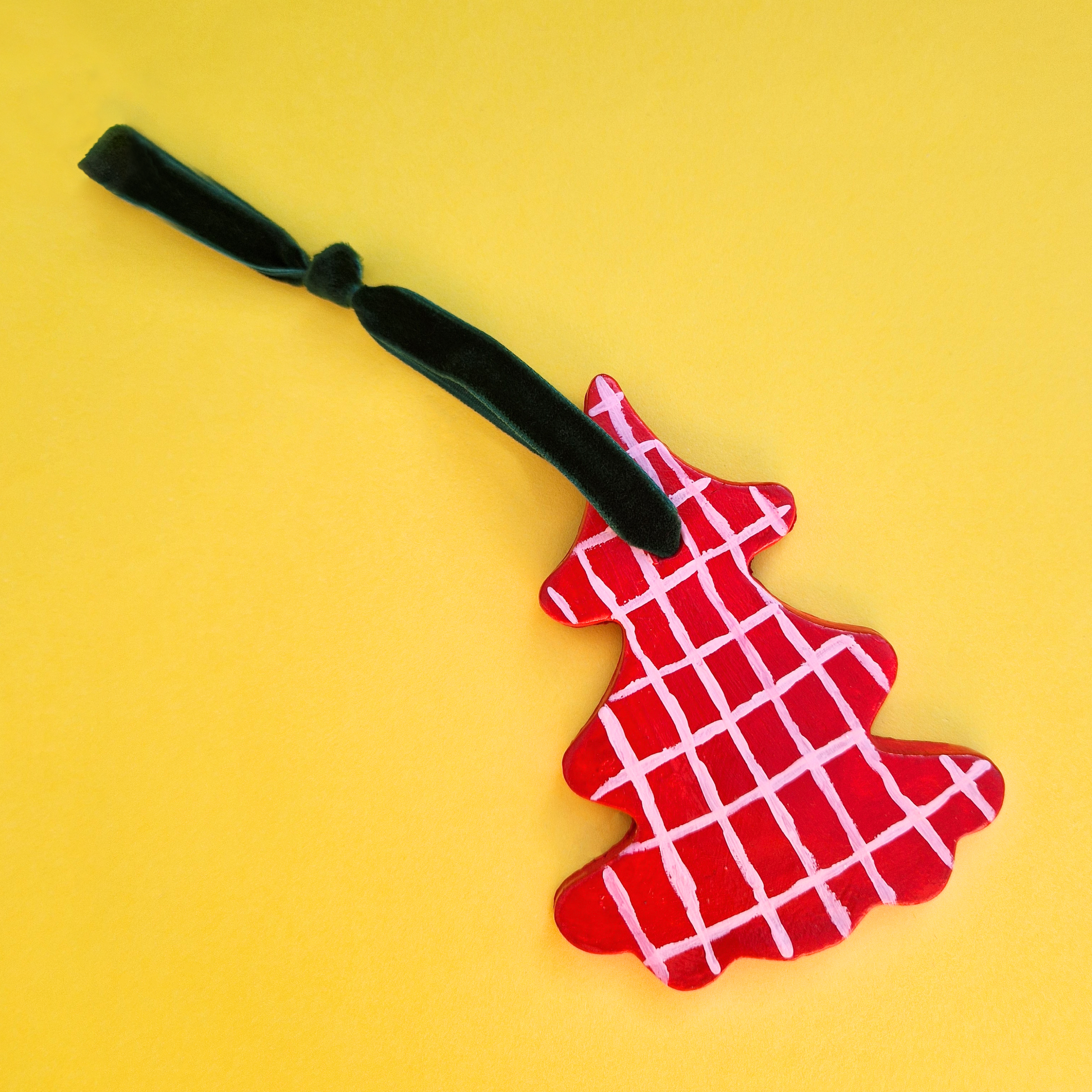 Χειροποίητο Χριστουγεννιάτικο Κεραμικό Στολίδι Κόκκινο Έλατο Ροζ Καρό