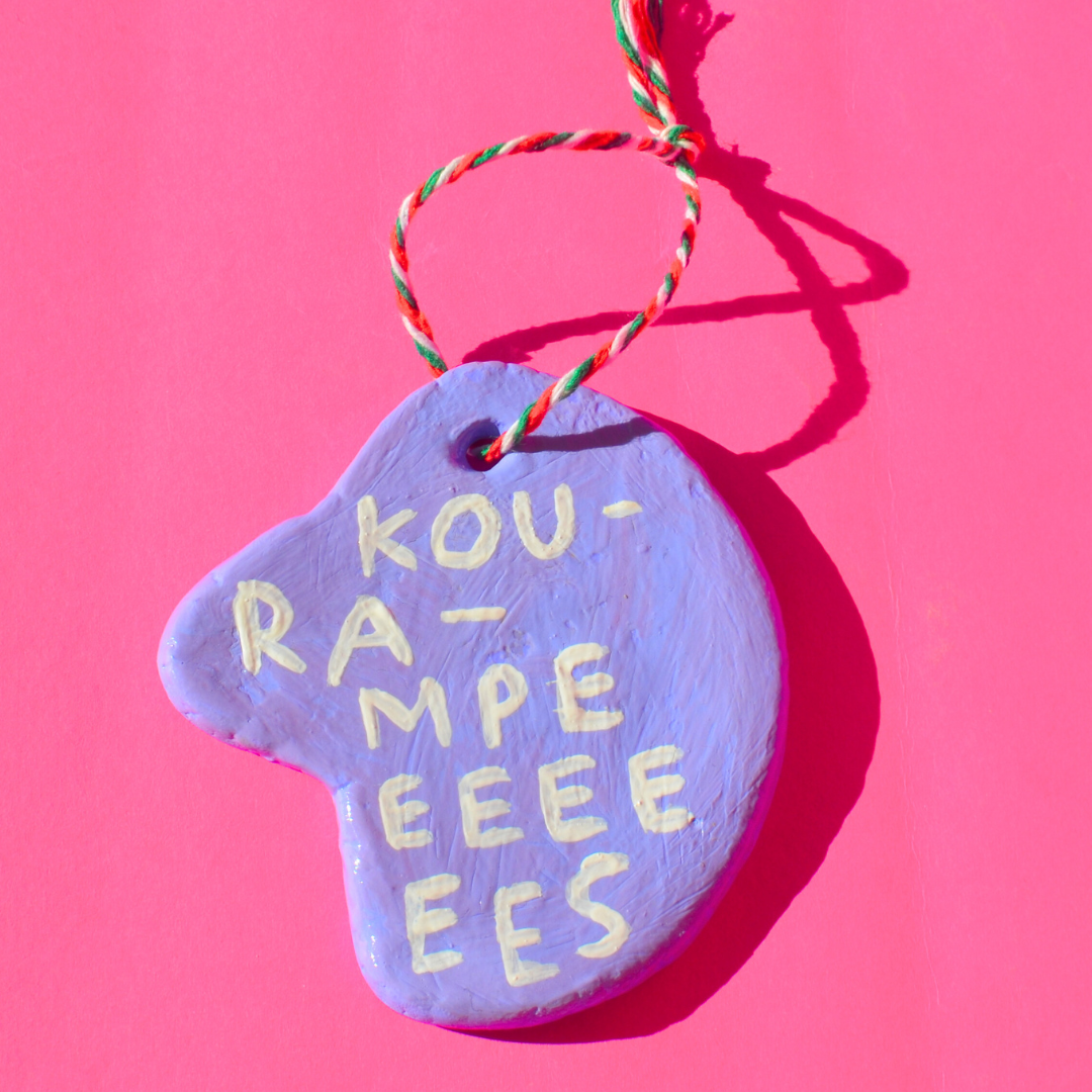 Το Χειροποίητο Χριστουγεννιάτικο Κεραμικό Στολίδι Λιλά Kourampeeeeeees, ζωγραφισμένο στο χέρι με ακανόνιστο σχήμα, είναι ιδανικό για χριστουγεννιάτικο δέντρο ή διακόσμηση σπιτιού. Για τους λάτρεις των κουραμπιέδων, φέρνει γιορτινή ζεστασιά, παιχνιδιάρικη διάθεση και μοναδικότητα, προσθέτοντας χειροποίητο μαγικό χαρακτήρα.