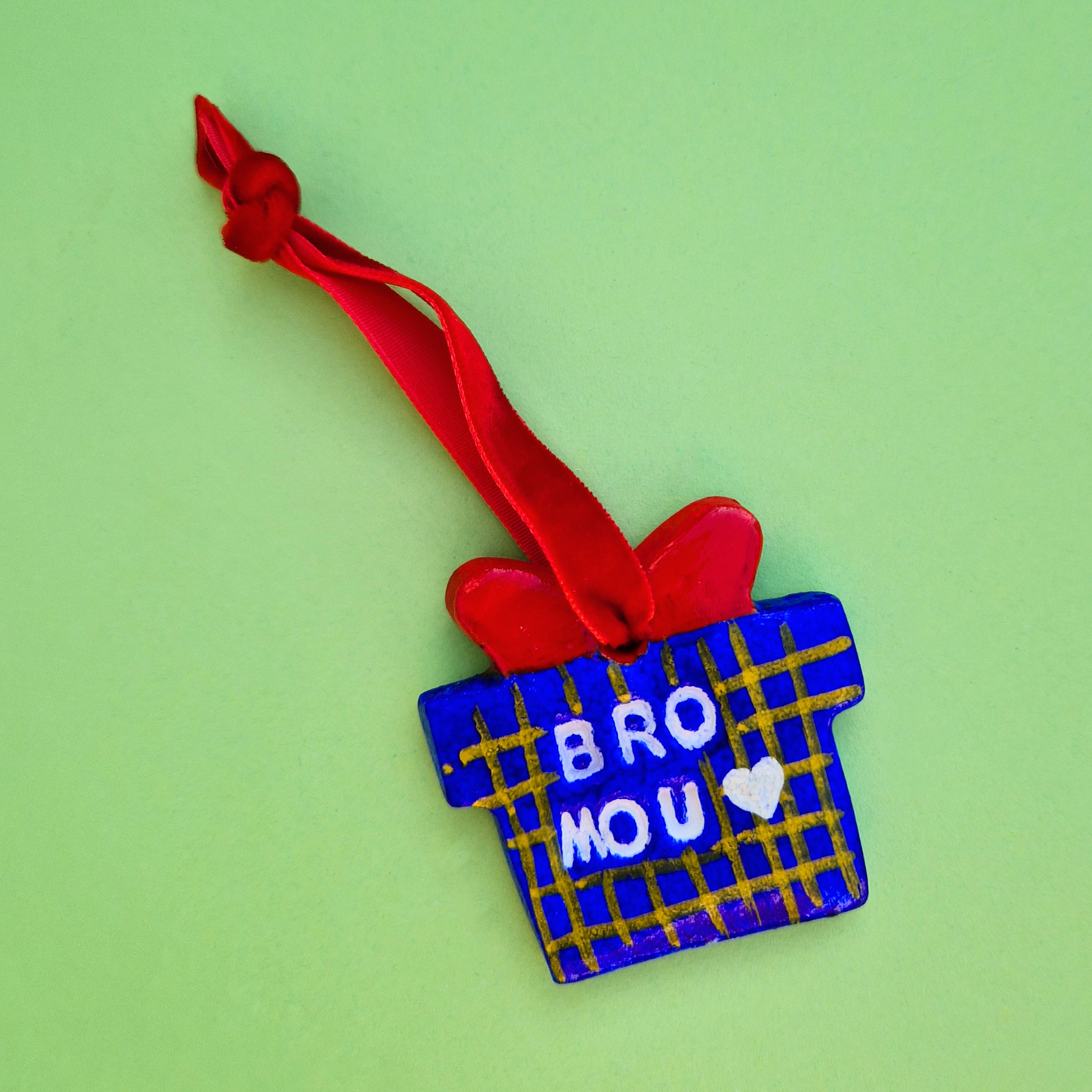 Το Χειροποίητο Χριστουγεννιάτικο Κεραμικό Στολίδι Μπλε Gift Box Μπρο μου 💜 (Bro Mou) είναι το ιδανικό δώρο για τον αδελφό σας, φέρνοντας χαρά, αγάπη και γιορτινή διάθεση στο δέντρο και το σπίτι σας. Με λεπτομέρειες ζωγραφισμένες στο χέρι, προσθέτει μοναδικότητα, ζεστασιά και συναισθηματική αξία, ιδανικό για ξεχωριστές στιγμές.