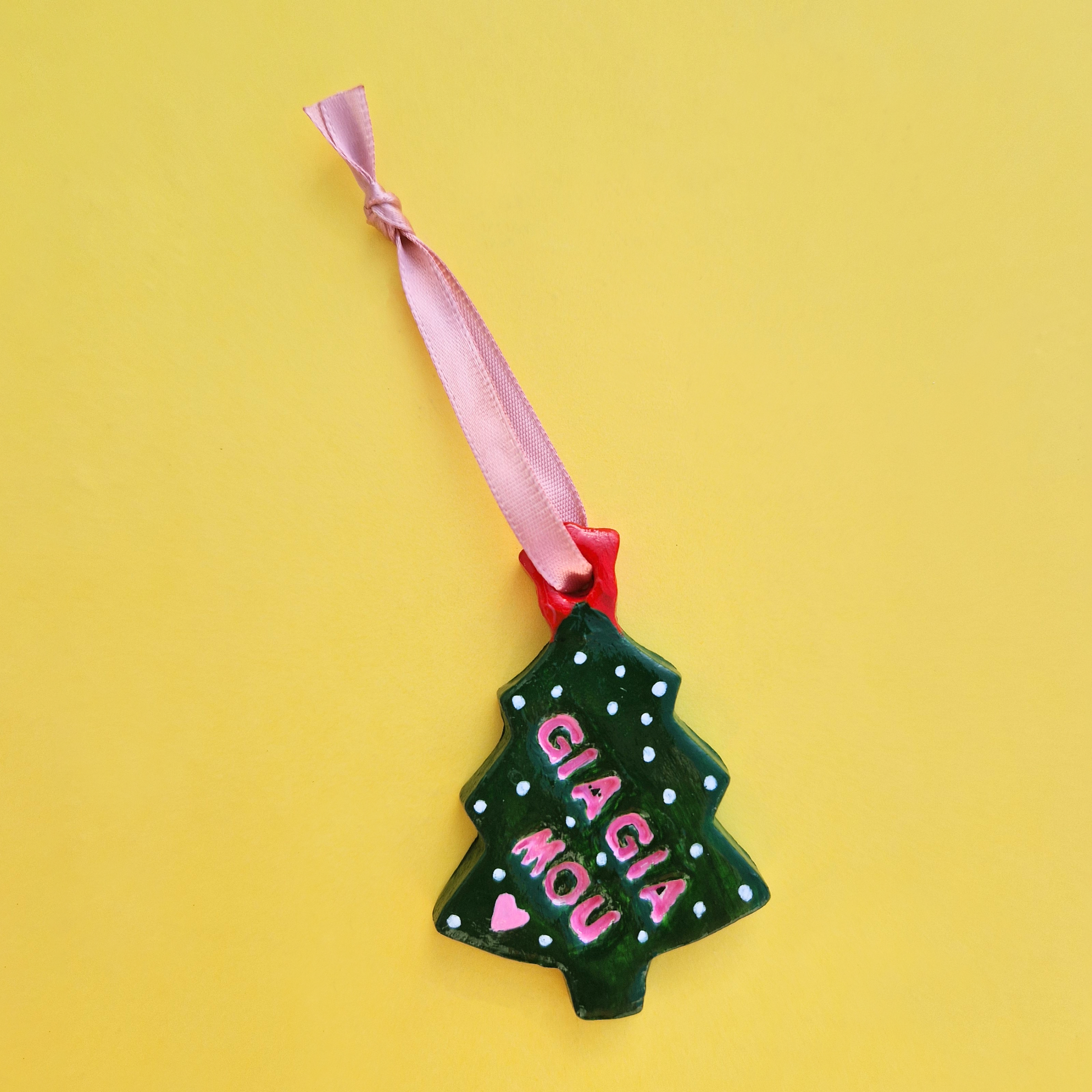 Χειροποίητο Χριστουγεννιάτικο Κεραμικό Στολίδι Πράσινο 'Ελατο Γιαγιά μου 💜 (Giagia Mou) είναι ένα τρυφερό και γιορτινό δώρο γεμάτο αγάπη. Ζωγραφισμένο στο χέρι, προσθέτει ζεστασιά και συγκίνηση στο δέντρο ή τη διακόσμηση του σπιτιού σας. Το ιδανικό δώρο για τη γιαγιά σας, που θα φωτίσει τις γιορτές με αγάπη και χαμόγελα.