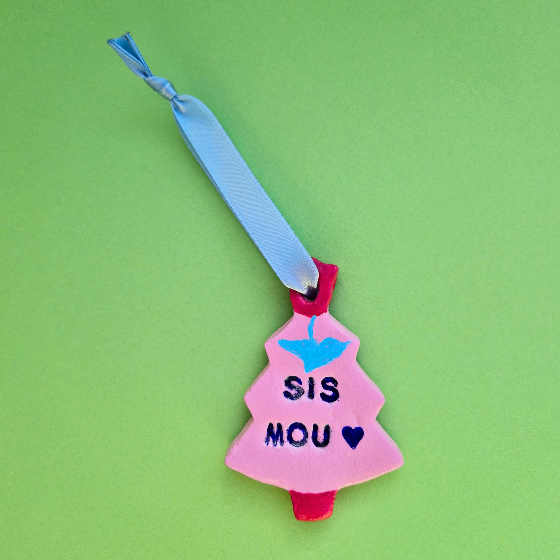 Το Χειροποίητο Χριστουγεννιάτικο Κεραμικό Στολίδι Ροζ Έλατο Σις Μου 💜 (Sis Mou) είναι το τέλειο δώρο για την αδερφή σας. Με ροζ χρώμα, ζωγραφισμένο στο χέρι και γιορτινή λεπτομέρεια, φέρνει χαρά, αγάπη και γιορτινή ατμόσφαιρα στο χριστουγεννιάτικο δέντρο και στη διακόσμηση του σπιτιού σας, δημιουργώντας μοναδικές αναμνήσεις.