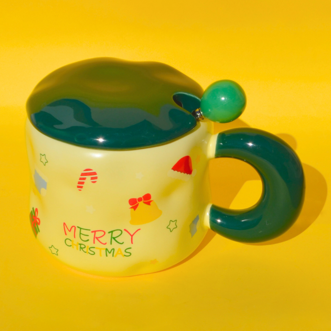 Χριστουγεννιάτικη Πορσελάνινη Λευκή Κούπα με Πράσινο Καπάκι και Κουτάλι